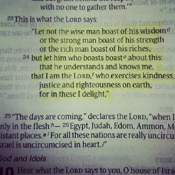 Verse: Let not the wise man glory in his wisdom. Let not the mighty man glory and his might. Nor the rich man glory in his riches. Let him who glories, glory in this, that he understands and knows Me. Jeremiah 9:23